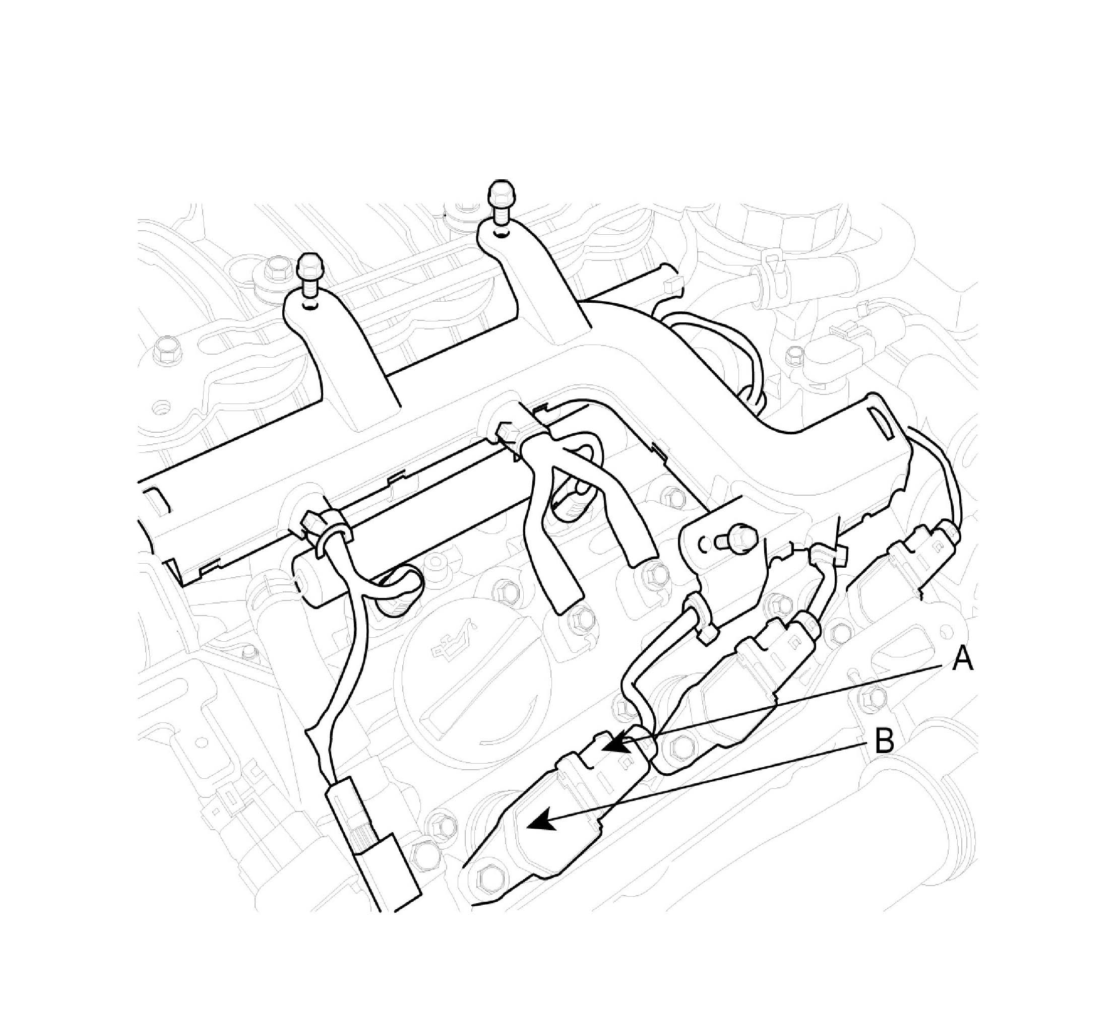 3. Remove the ignition coil connectors (A) and ignition coils (B).