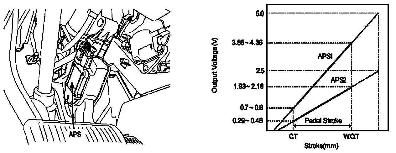 Accelerator Position Sensor (APS) is installed on the accelerator pedal module and detects the rotation angle of the accelerator pedal. The APS is one of the most important sensors in engine control system, so it consists of the two sensors which adapt individual sensor power and ground line. The second sensor monitors the first sensor and its output voltage is half of the first one. If the ratio of the sensor 1 and 2 is out of the range (approximately 1/2), the diagnostic system judges that it is abnormal.