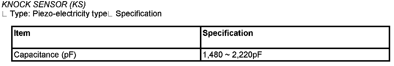 Knocking is a phenomenon characterized by undesirable vibration and noise and can cause engine damage. Knock Sensor (KS) senses engine knocking and the two sensors are installed inside the V-valley of the cylinder block. When knocking occurs, the vibration from the cylinder block is applied as pressure to the piezoelectric element. At this time, this sensor transfers the voltage signal higher than the specified value to the PCM and the PCM retards the ignition timing. If the knocking disappears after retarding the ignition timing, the PCM will advance the ignition timing. This sequential control can improve engine power, torque and fuel economy.
