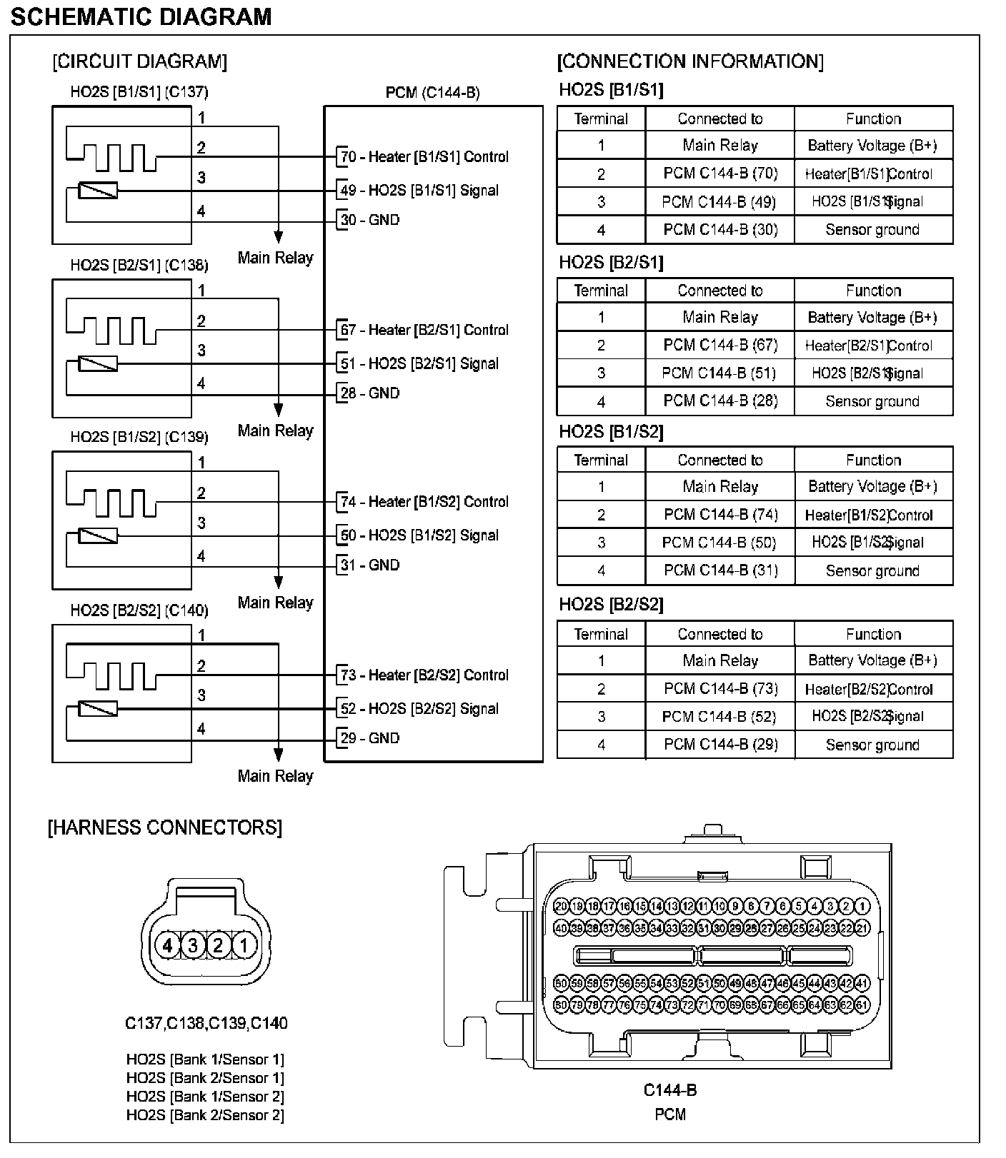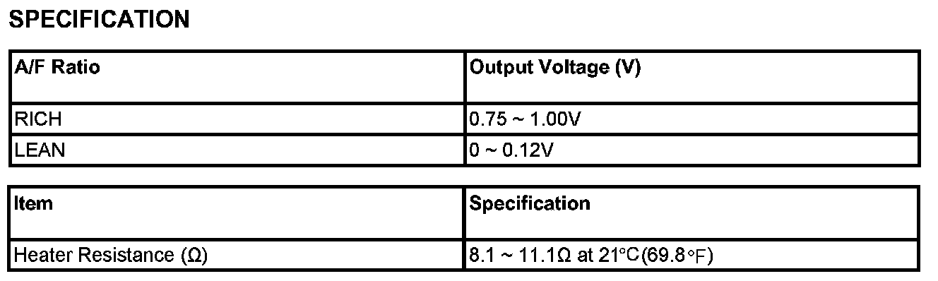 Heated Oxygen Sensor (HO2S) consists of zirconium and alumina and is installed on upstream and downstream of the Manifold Catalyst Converter (MCC). After it compares oxygen consistency of the atmosphere with the exhaust gas, it transfers the oxygen consistency of the exhaust gas to the PCM. When A/F ratio is rich or lean, it generates approximately 1 V or 0 V respectively. In order that this sensor normally operates, the temperature of the sensor tip is higher than 370 °C (698 °F). So it has a heater which is controlled by the PCM duty signal. When the exhaust gas temperature is lower than the specified value, the heater warms the sensor tip.