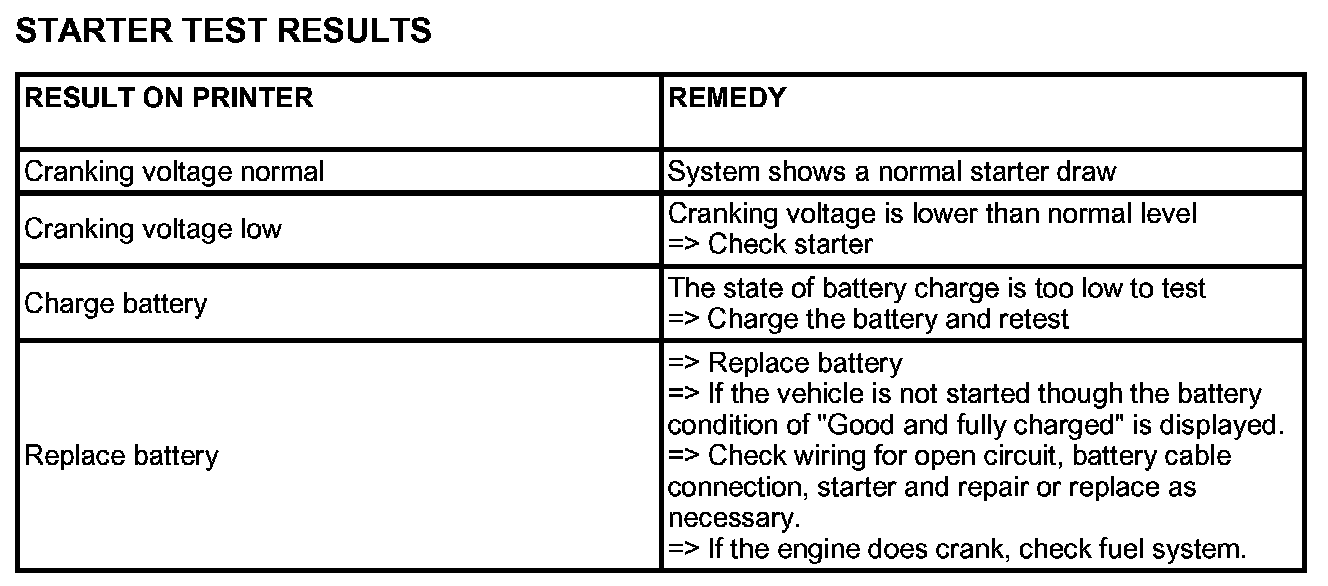 9. Cranking voltage and starter test results will be displayed on the screen. Take a relevant action according to the test results by referring to the starter test results as given.