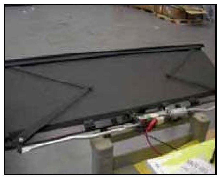 10. Place the assembly on a flat work surface and extend the shade to 100% of it's full travel by using a 12v battery or 12v power supply connected to the motor leads as follows: