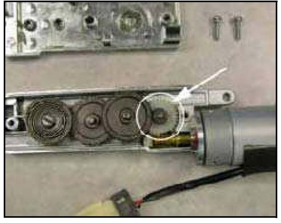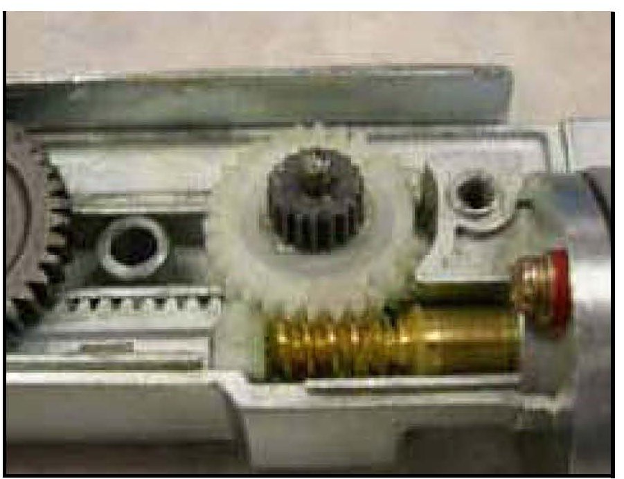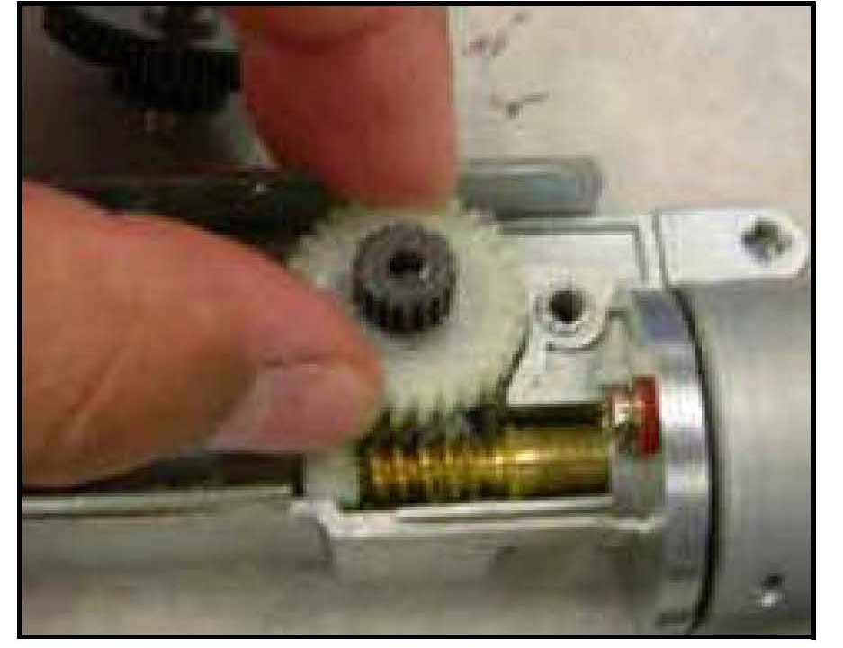 4. Remove the motor gear box top cover and locate the plastic drive gear attached to the brass worm gear as shown.