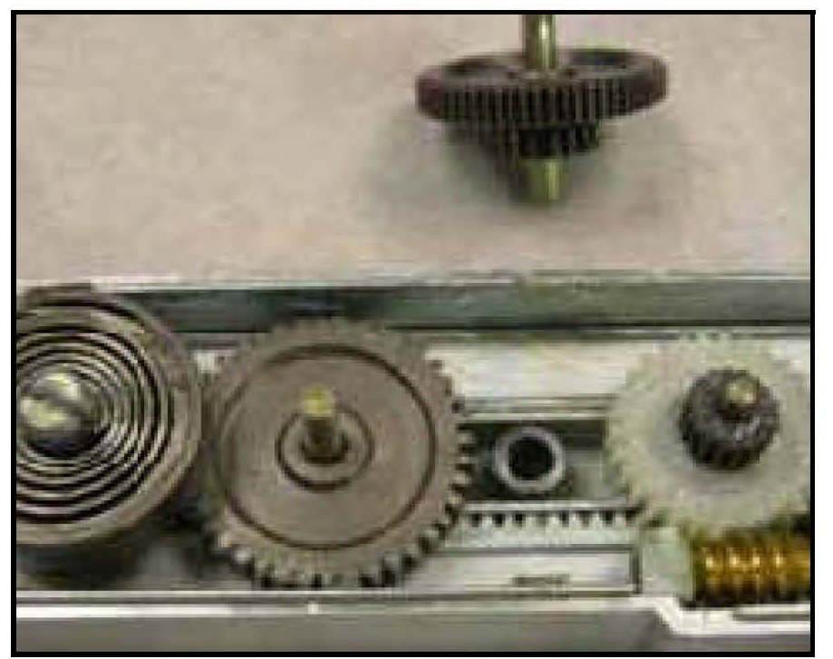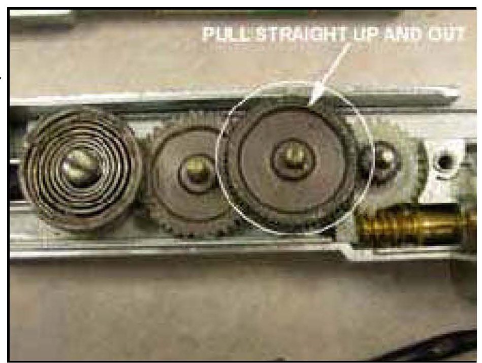 5. Remove the 2nd drive gear to access the plastic drive gear as shown. Gear is removed by pulling it straight up and out.