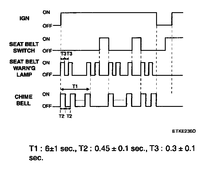 1) Since the ignition is switched ON, the seat belt warning indicator is illuminated (with period: 0.6 sec, duty rate: 50%) until the seat belt switch is ON and the chime bell is sounded (with period: 0.9 sec., duty rate: 50%) for 6 seconds