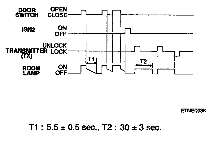 5) With keyless UNLOCK, when the door is closed, the room lamp is turned ON, then OFF after about 30 seconds While the room lamp is ON due to keyless UNLOCK, if another UNLOCK is received, the room lamp is again ON for 30 seconds