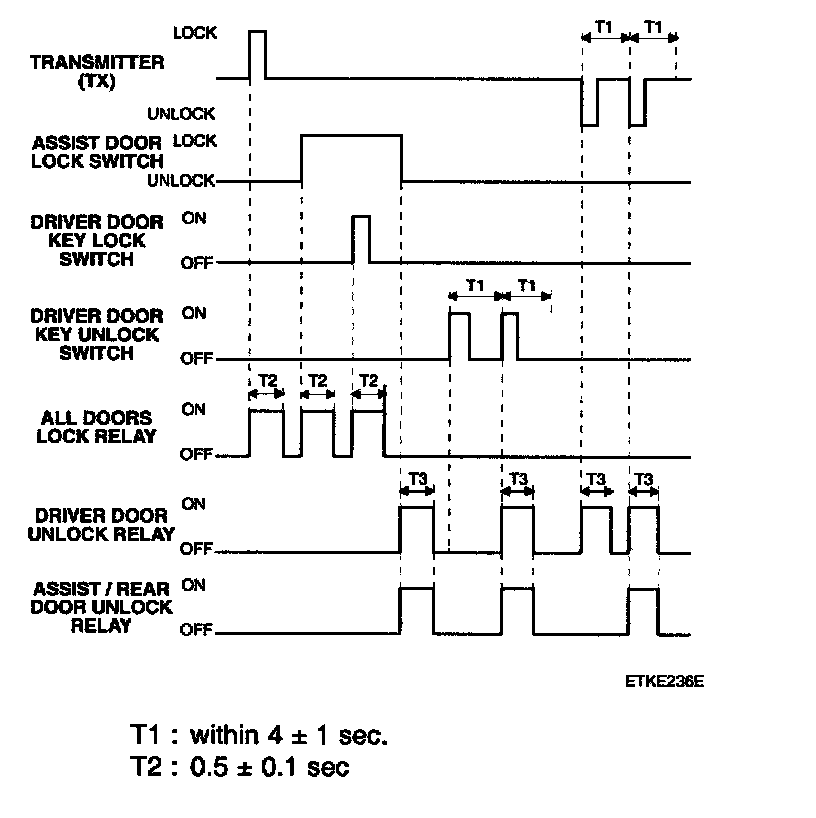 3) If the transmitter's lock signal is received, the all doors' lock output is ON for 0.5 second