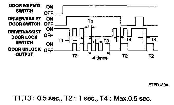 4) If the driver's door key unlock switch is OFF to ON, the driver's door unlock output is ON and then if the driver's door key unlock switch is ON within 4 seconds, the all doors' unlock output is ON for 0.5 second