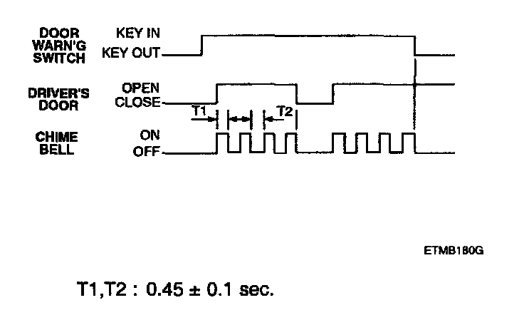 1) If the key is in the ignition key cylinder and the driver's door is opened, the chime bell sounds continually (period: 0.9 sec Duty rate: 50%).