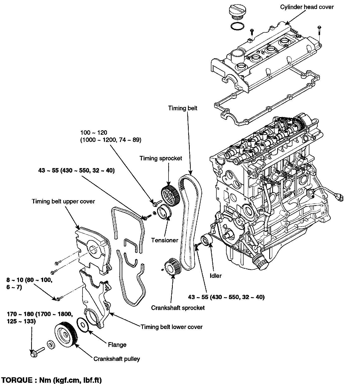 Belt so as not give slack at each center of shaft. Do as following procedures when installing timing belt. Crankshaft sprocket (A) -> Idler pulley (B) -> Camshaft sprocket (C) -> timing belt tensioner (D).