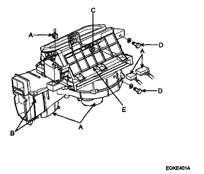 3. Disconnect the connectors (A) from the blower relay the blower motor, the blower resistor (or power transistor) and the fresh and recirculation actuator. Remove the self-tapping screws (B), the mounting nut (C), the mounting bolts (D) and the blower unit (E).