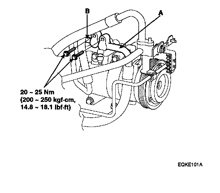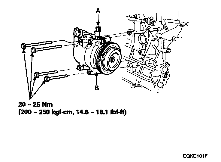 6. Disconnect the compressor clutch connector (A), then remove the mounting bolts and the compressor (B).