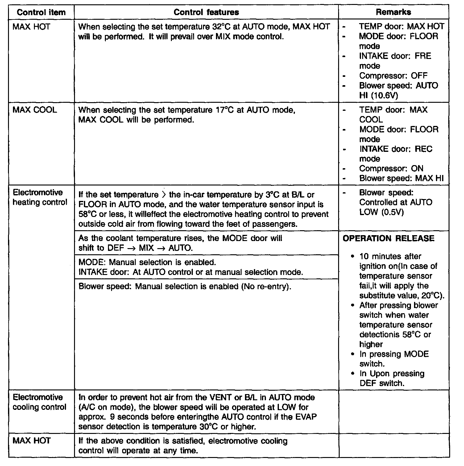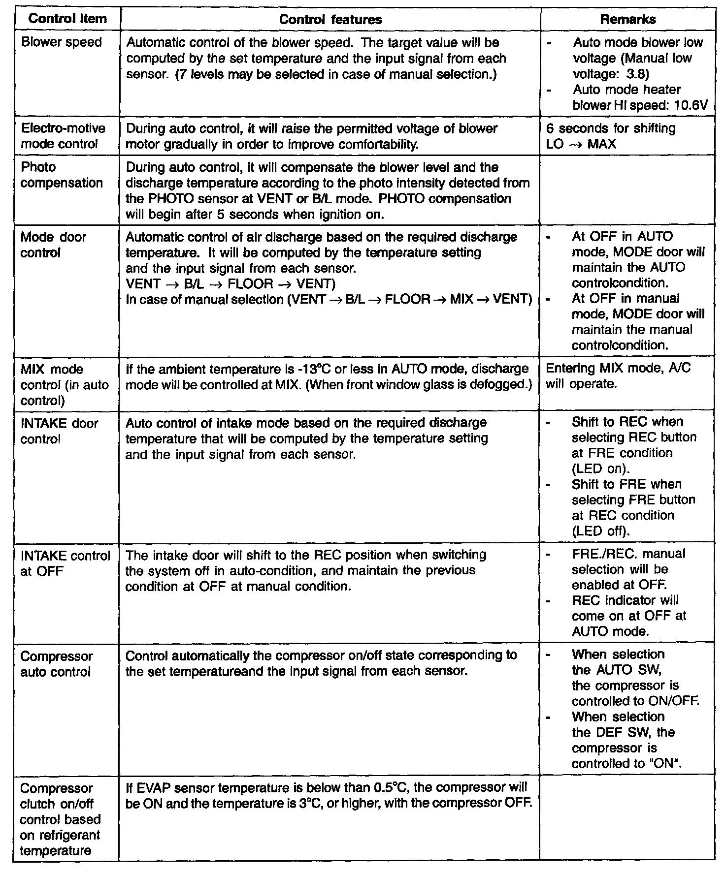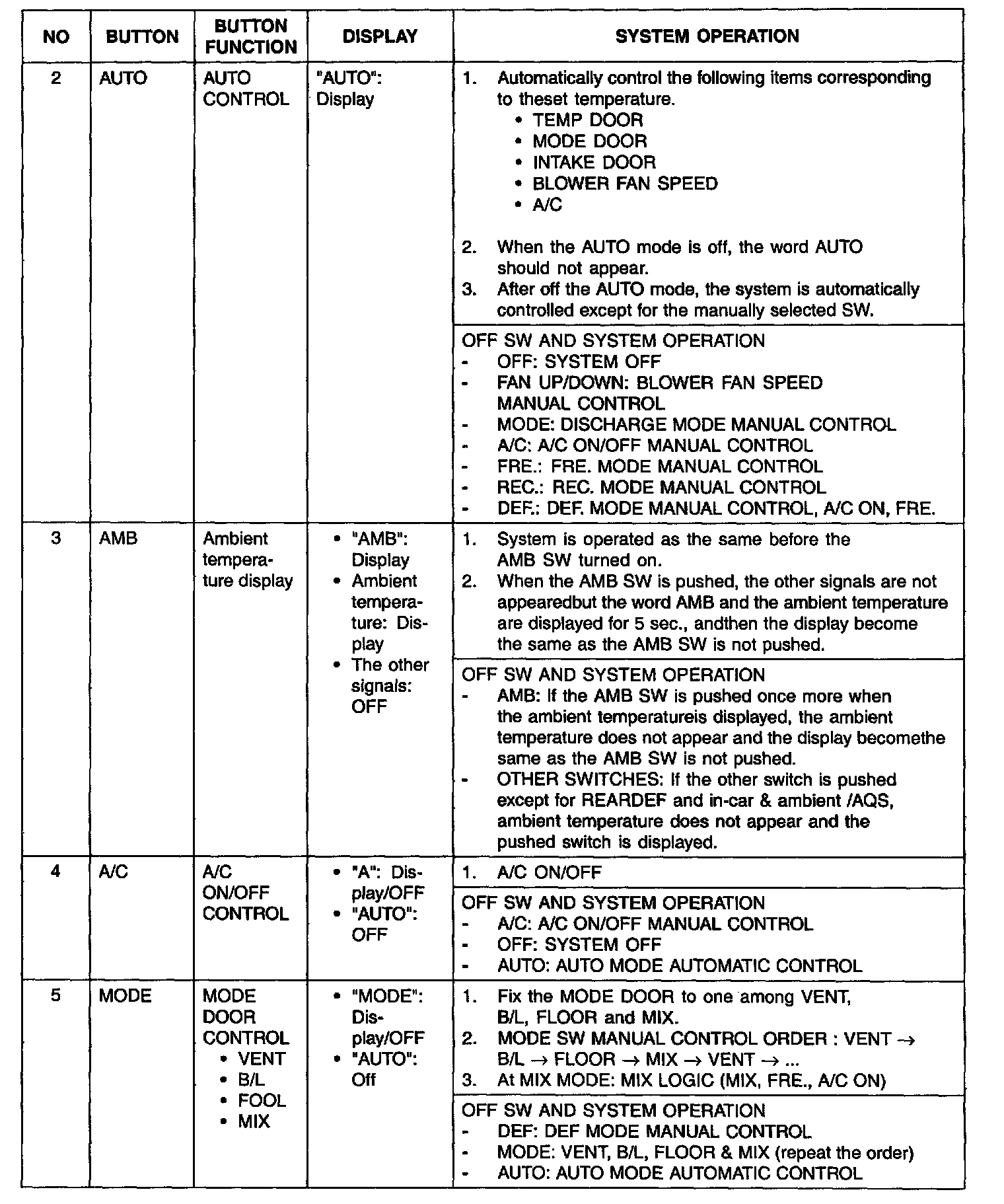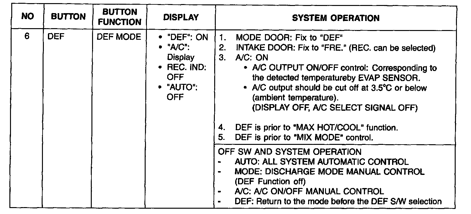 During mode control, the A/C may operate during DEF or MIX mode.In order to enable dehumidification, the driver may select A/C OFF during the A/C on condition