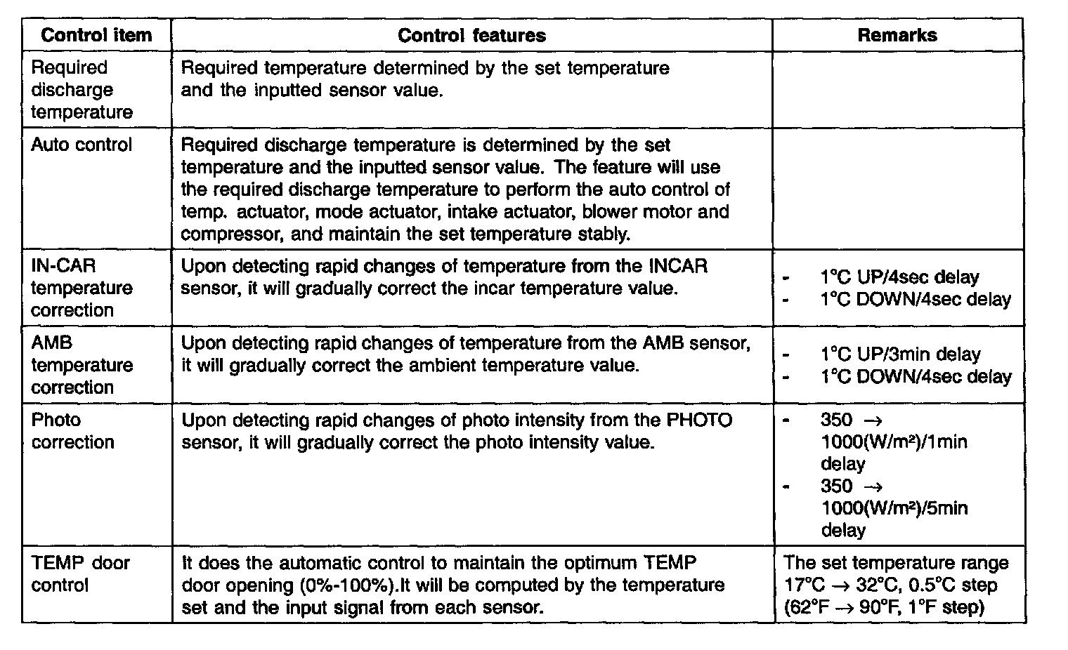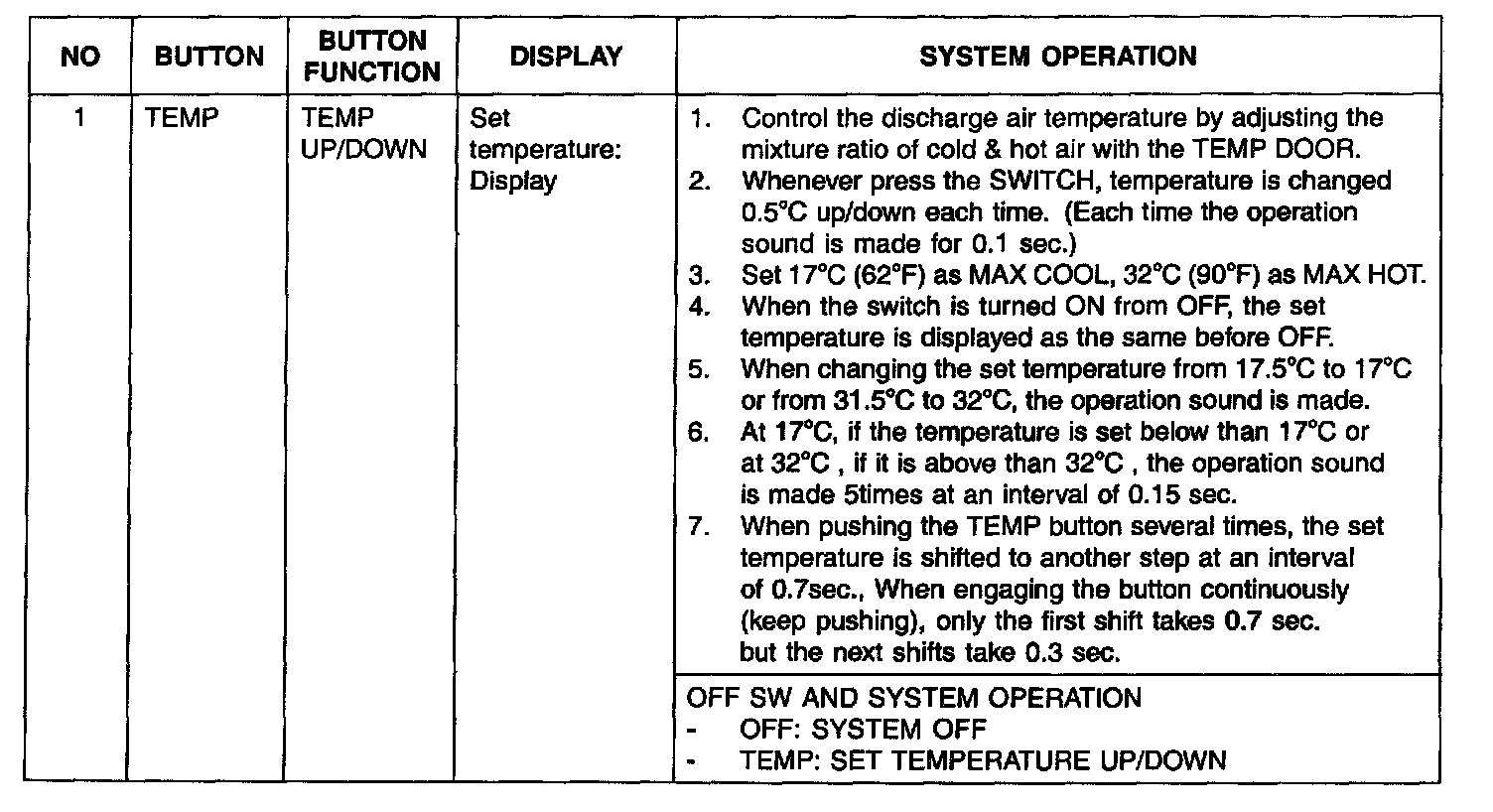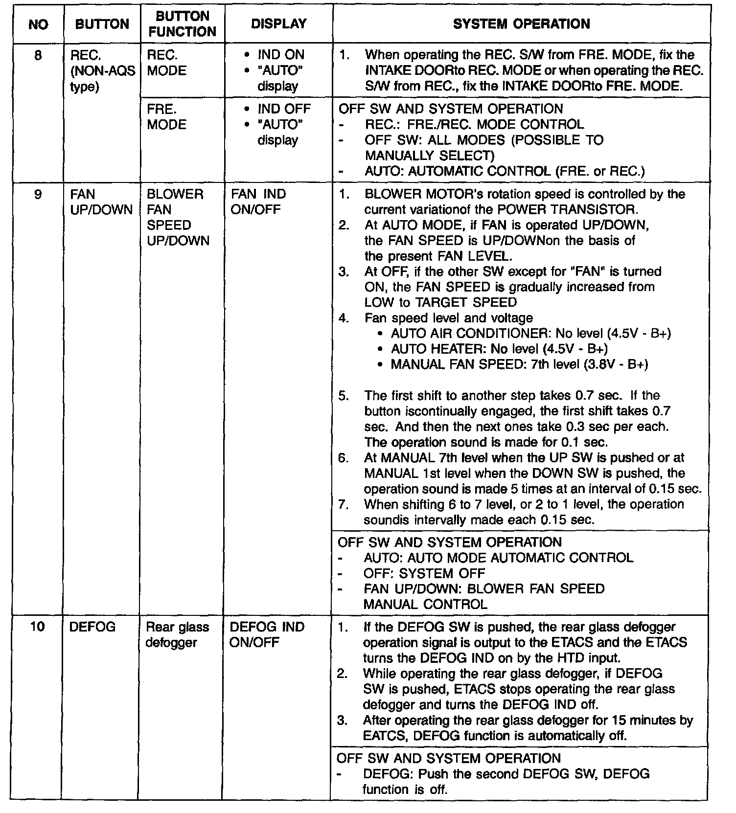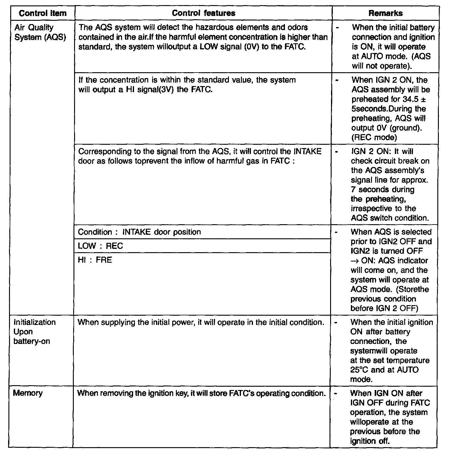 During mode control, the A/C may operate during DEF or MIX mode.In order to enable dehumidification, the driver may select A/C OFF during the A/C on condition