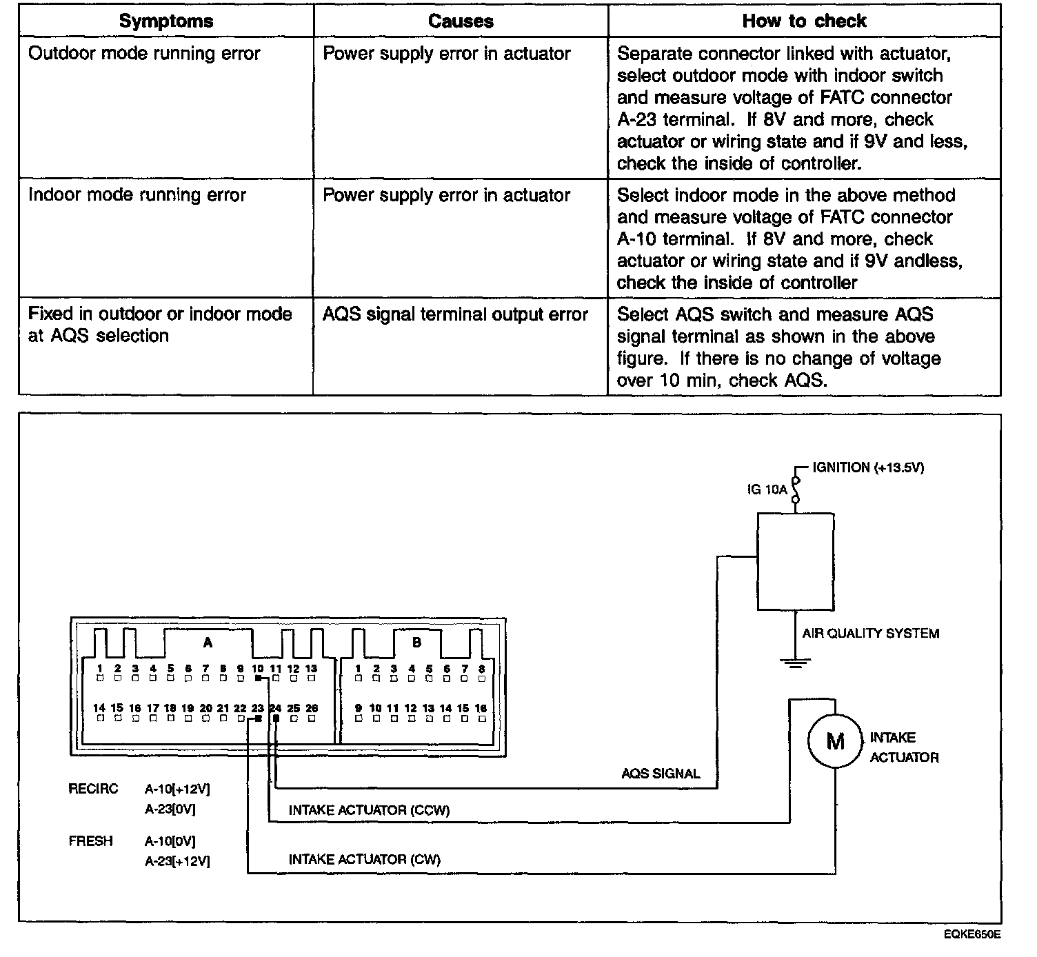 In turning on IG and selecting outdoor mode with indoor switch, 12 V is outputted from FATC connector A-23 terminal, 0 V is supplied for A-10 terminal and motor works in direction of outdoor. In selecting indoor mode with indoor switch, 12 V is outputted from FATC connector A-10 terminal, 0 V is supplied for A-23 terminal and motor works in direction of indoor.