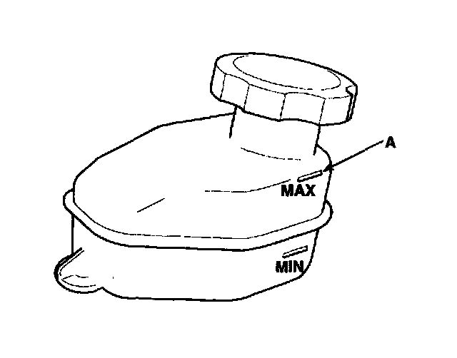 1. Make sure the brake fluid level in the reservoir is at the MAX (upper) level line (A).