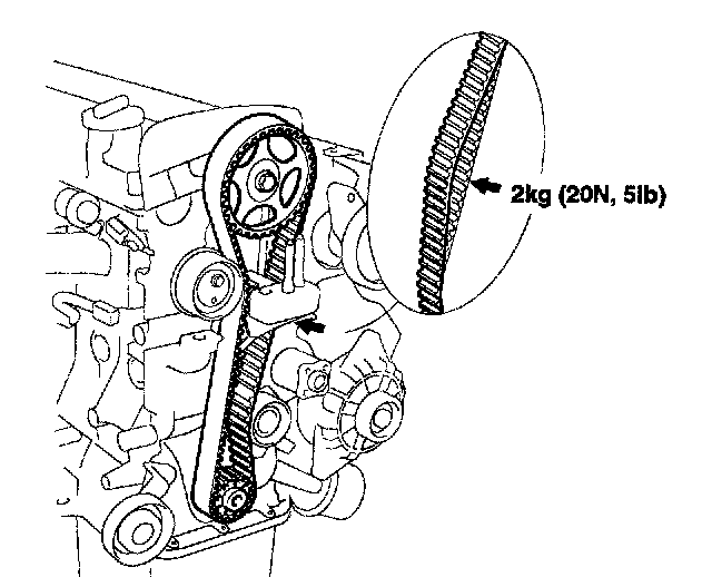 4. Recheck the belt tension, When the tension side of timing belt is pushed horizontally with a moderate force [approximately 2 kg (20 N, 5 lbs.)], the timing belt cog end segs in approximately 4 - 6 mm (0.16 - 0.24 inch)
