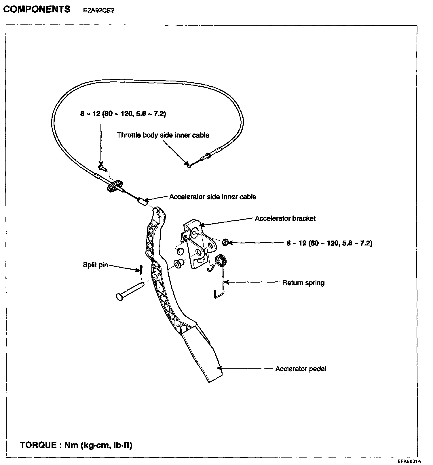 Accelerator pedal bracket bolts: 8 - 12 Nm (0.8 - 1.2 kgf.m, 5.8 - 7.2 lbf.ft)