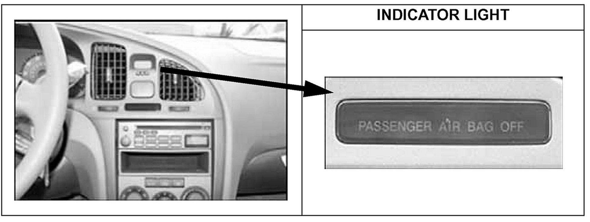 ^ When an adult passenger is detected, the passenger air bag, passenger side impact air bag, and passenger seat belt pretensioner circuitry is enabled and the "PASSENGER AIR BAG OFF" indicator light is turned off. If an adult passenger is not detected, or when a child restraint system or child is detected, the passenger air bag, passenger side impact air bag, and passenger seat belt pretensioner circuitry is disabled and the "PASSENGER AIR BAG OFF" indicator light is turned on.