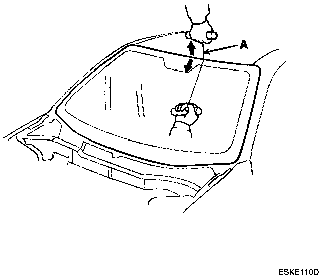 5. With a helper on the outside, pull the piano wire(A) back and forth in a sawing motion. Hold the piano wire as close to the windshield as possible to prevent damage to the body and dashboard. Carefully cut through the rubber dam and adhesive around the entire windshield.