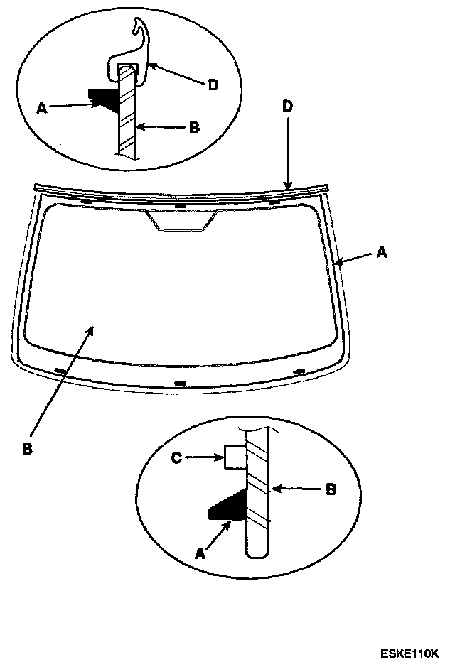 9. Pack adhesive into the cartridge without air pockets to ensure continuous delivery. Put the cartridge in a caulking gun, and run a bead of adhesive (A) around the edge of the windshield (B) between the fastener (C) and molding (D) as shown. Apply the adhesive within 30 minutes after applying the glass primer. Make a slightly thicker bead at each corner.