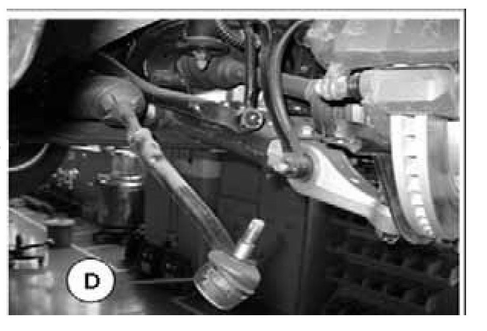 3. Remove the split pin and the nut holding the tie rod end (D) to the knuckle. Using the special tool (09568-4A000), disengage the tie rod end (D) from the knuckle. Tie rod end to knuckle nut torque: 2.4~3.4kgf-m (18~25lb-ft)