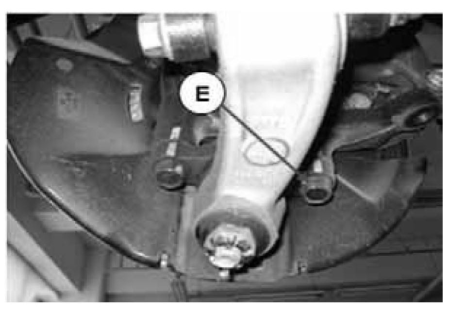 4. Remove the 2 bolts (E) and disengage the lower arm ball joint from the knuckle. Lower arm ball joint to knuckle nut torque: 10~12kgf-m (74~88 lb-ft)