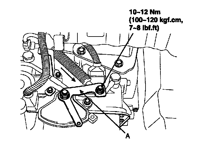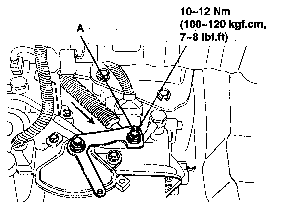 6. Gently pull the transmission control cable in the direction of the arrow, and then tighten the adjusting nut (A).