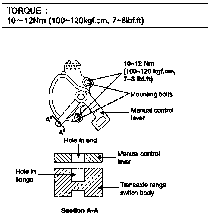 4. Loosen the transaxle range switch body mounting bolts and then turn the transaxle range switch body so the hole in the end of the manual control lever and the hole (cross section A-A in the figure) in the flange of the transaxle range switch body flange realigned.