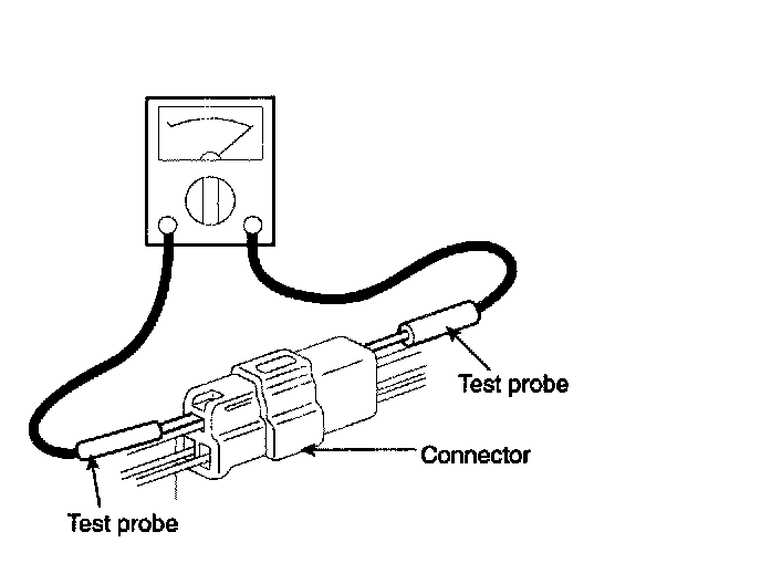 11. When using a circuit tester to check continuity or voltage on connector terminals, insert the test probe into the harness side. If the connector is a sealed connector, insert the test probe through the hole in the rubber cap until it contacts the terminal, being careful not to damage the insulation of the wires.