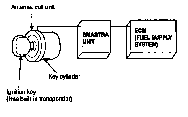 The SMARTRA carries out communication with the built-in transponder in the ignition key. This wireless communication runs on RF (Radio frequency of 125kHz). The SMARTRA is mounted behind of the crush pad under panel close to the antenna coil for RF transmission and receiving.The RF signal from the transponder, received by the antenna coil, is converted into messages for serial communication by the SMARTRA device. And, the received messages from the ECM are converted into an RF signal, which is transmitted to the transponder by the antenna.The SMARTRA does not carry out the validity check of the transponder or the calculation of encryption algorithm. This device is only an advanced interlace, which converts the RF data flow of the transponder into serial communication to the ECM and vice versa.