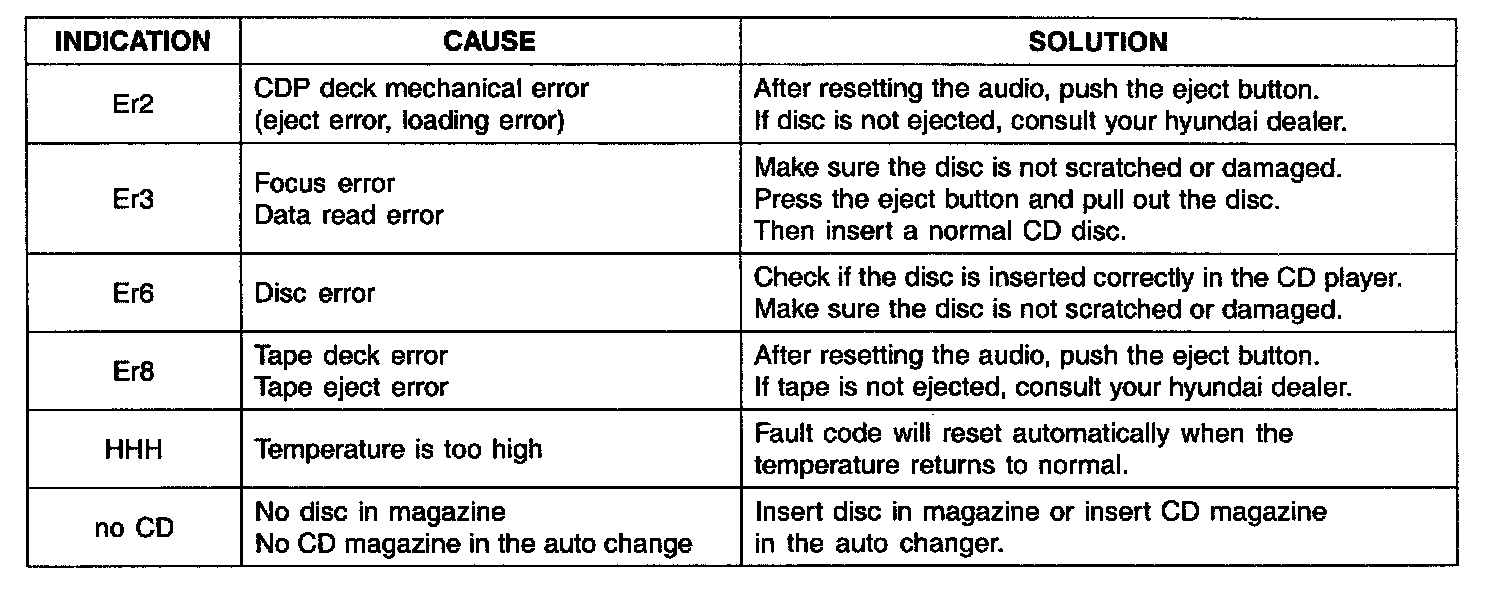 AUDIO FAULT CODEIf you see any error indication in the display while using the CD or Tape mode, find the cause in the chart.