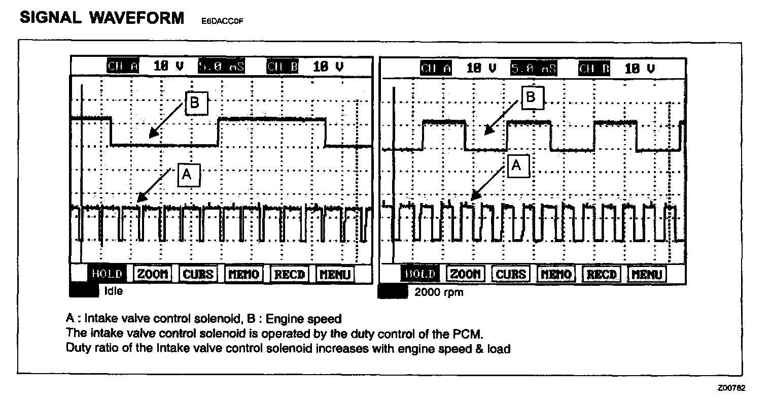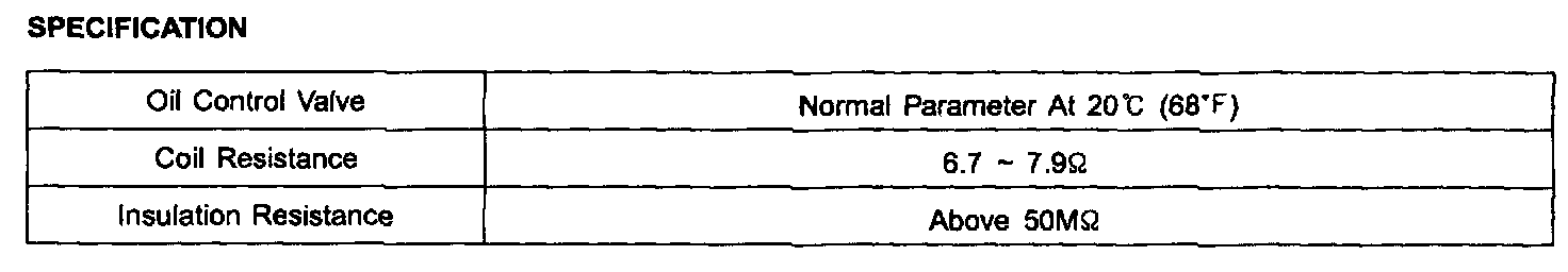 The CVVT (Continuously Variable Valve Timing) system built on the camshaft helps the engine decrease the exhaust gas and increase engine power and fuel economy by changing the valve open/close timing of the intake camshaft continuously. The oil control valve, the main control part of the CVVT, changes the direction of the oil path through the CVVT by the duty control of the PCM and changes the open and close timing of the intake and exhaust valves.