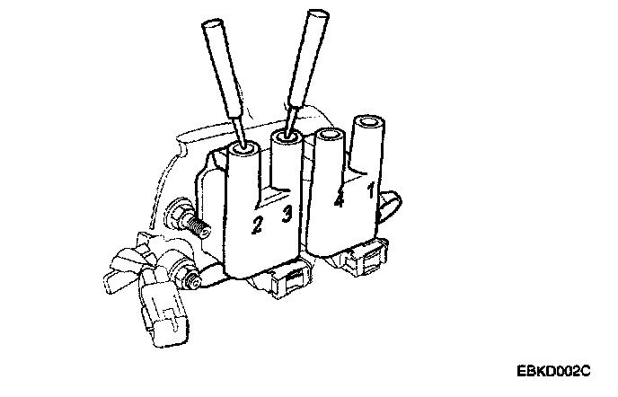 2. Measure the secondary coil resistance between the high-voltage terminal for the No.1 and No.4 cylinders, and between the high-voltage terminals for the No.2 and No.3 cylinders.
