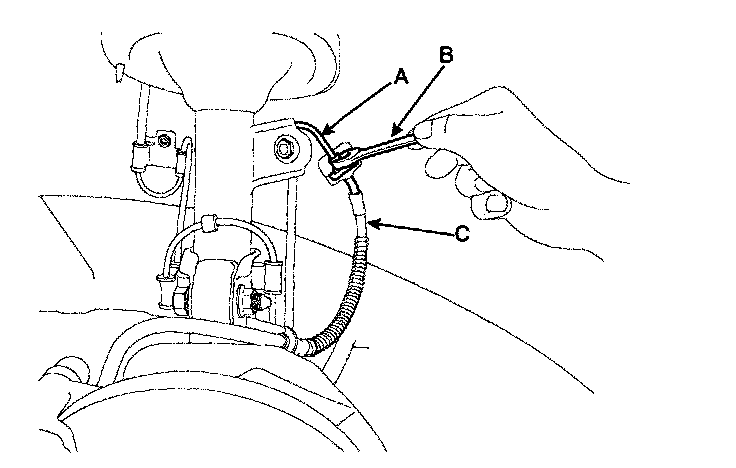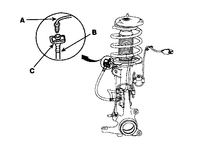 1. Disconnect the brake hose(C) from the brake line(A) using a flare-nut wrench(B).
