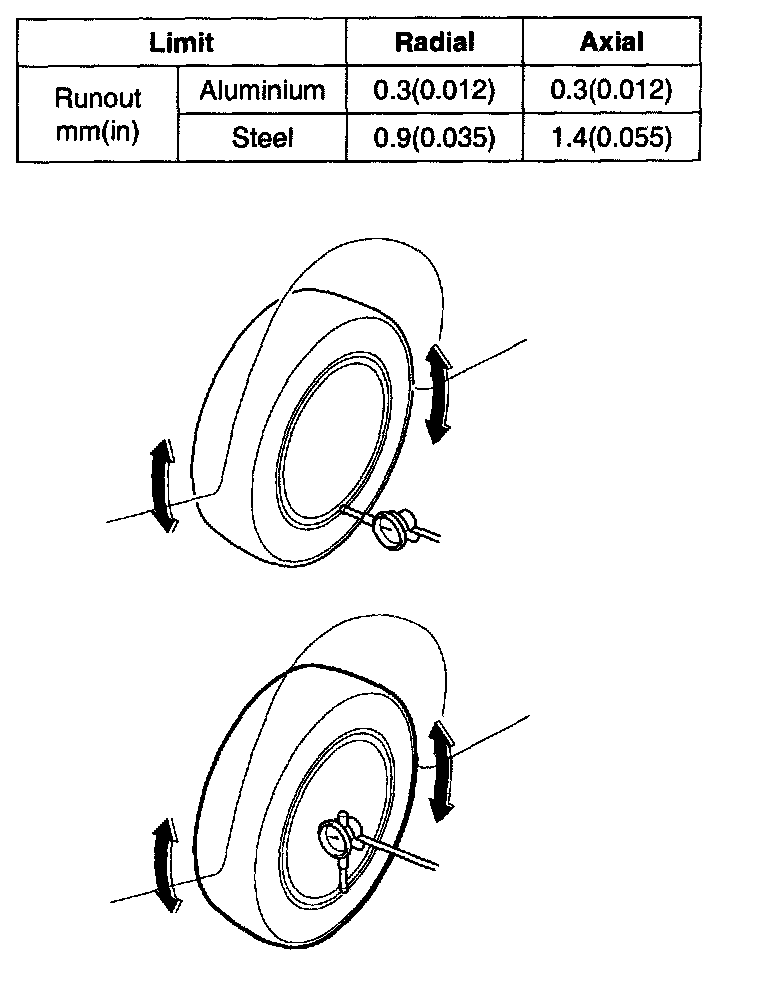 2. Measure the wheel runout with a dial indicator as illustrated.