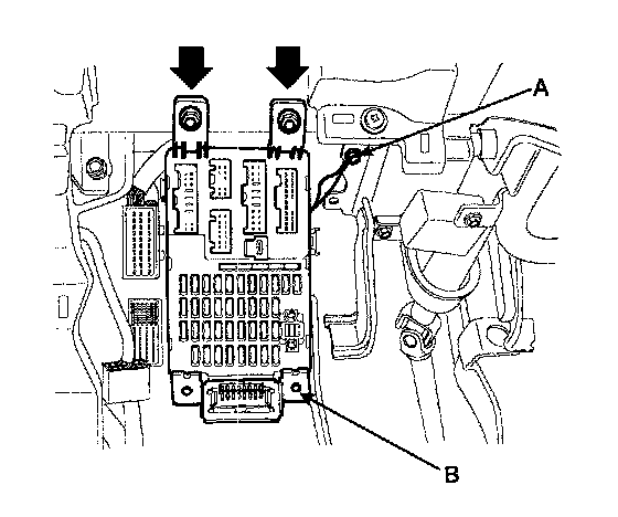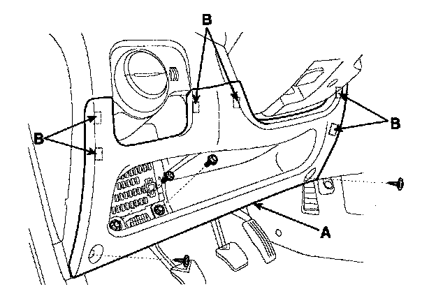 2. Remove the crash pad lower panel (A). Avoid damaging retaining clips (B).