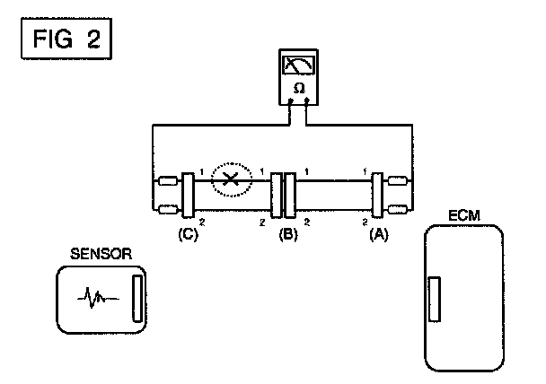 In [FIG.2.] the measured resistance of line 1 and 2 is higher than 1 Mohm and below 1 ohm respectively. Specifically the open circuit is line 1 (Line 2 is normal). To find exact break point, check sub line of line 1 as described in next step.