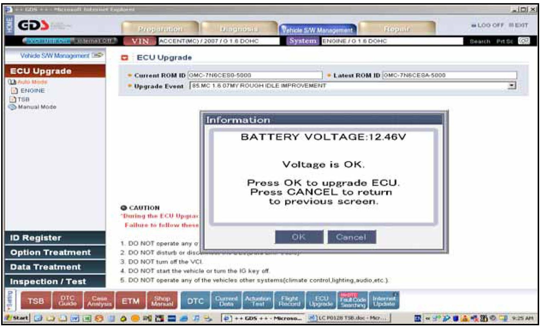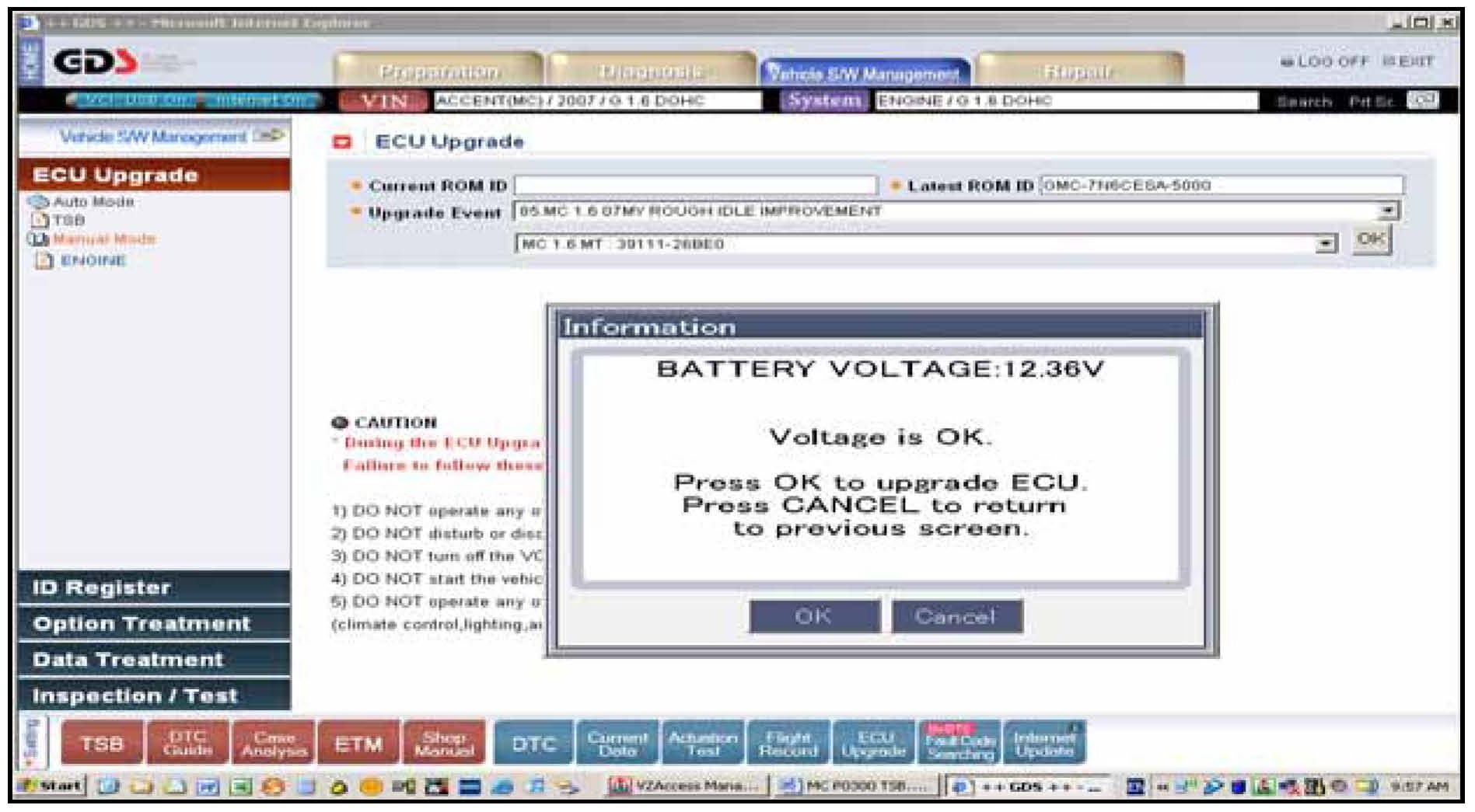 If voltage is below 12 volts then touch Cancel; run the engine for 10 minutes at idle and touch OK again at the previous screen to check that battery voltage then exceeds 12 volts.
