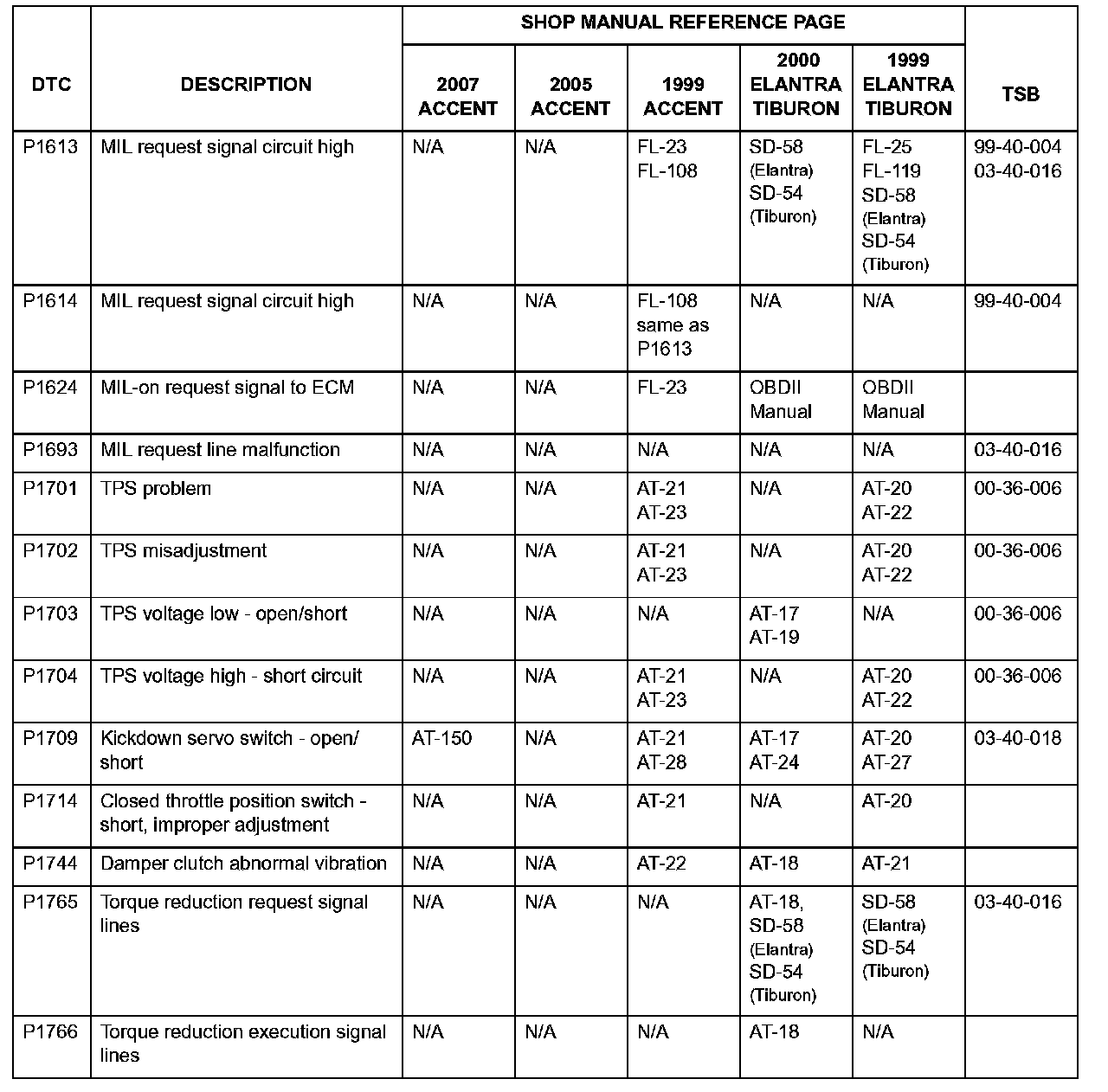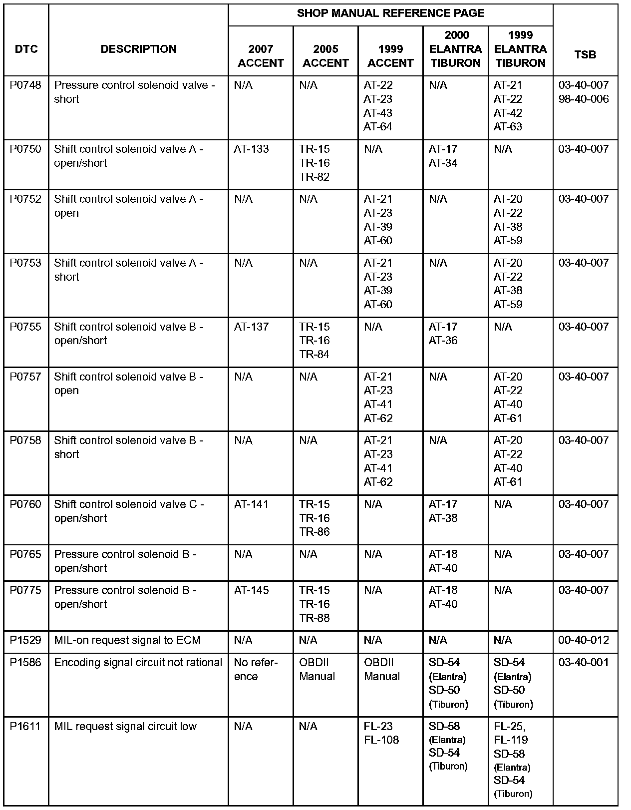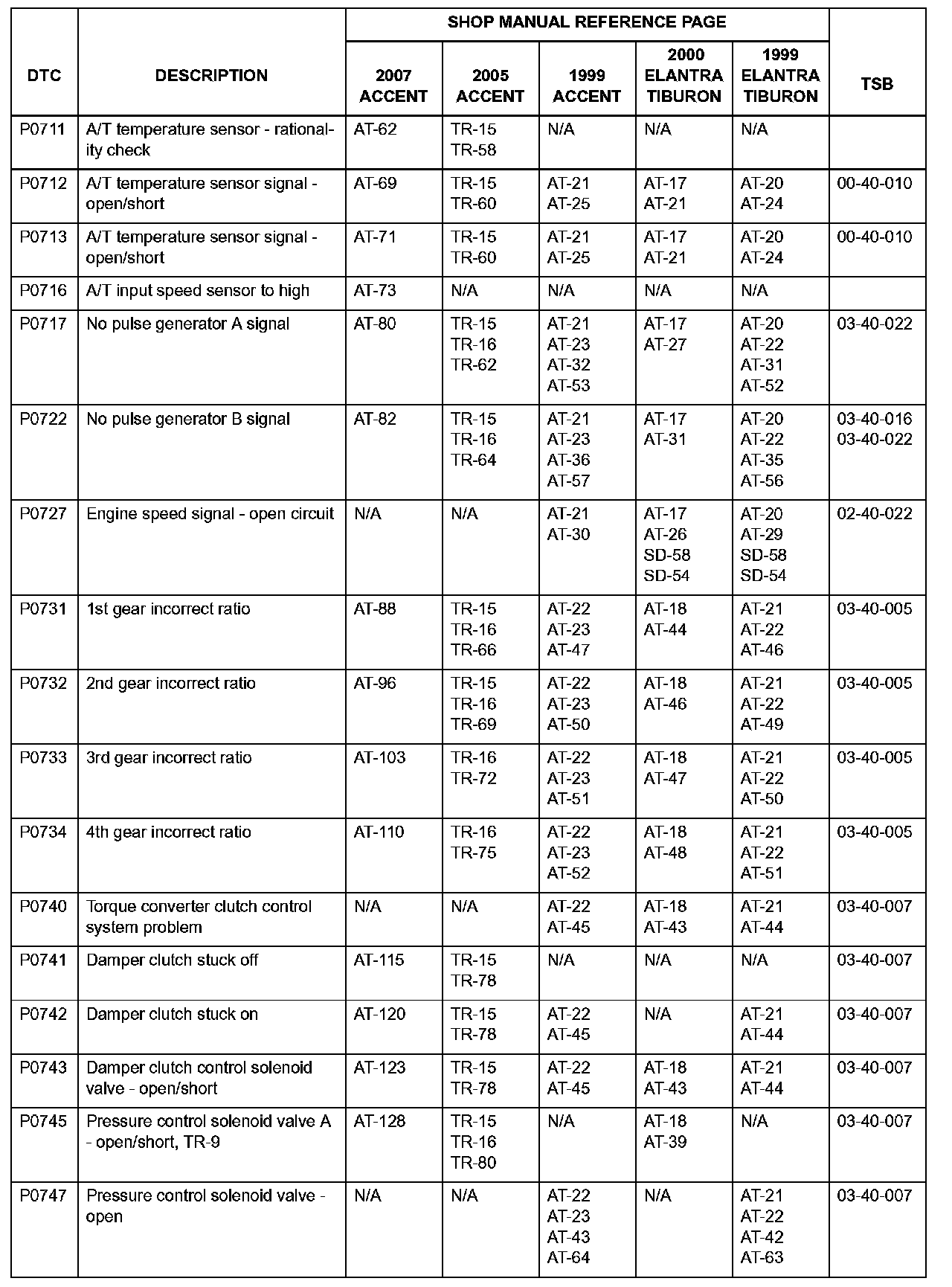 1996-2000 ELANTRA, 1997-2001 TIBURON AUTOMATIC TRANSAXLE DIAGNOSTIC TROUBLE CODES LIST
