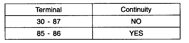 4. Apply 12 V to terminal 85 and ground to terminal 86. Check for continuity between terminals 30 and 87.