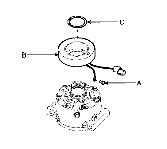 4. Remove the screw (A) from the field coil ground terminal. Remove the retainer ring (B) and then remove the field coil (C) from the shaft with a puller. Be careful not to damage the coil and compressor.