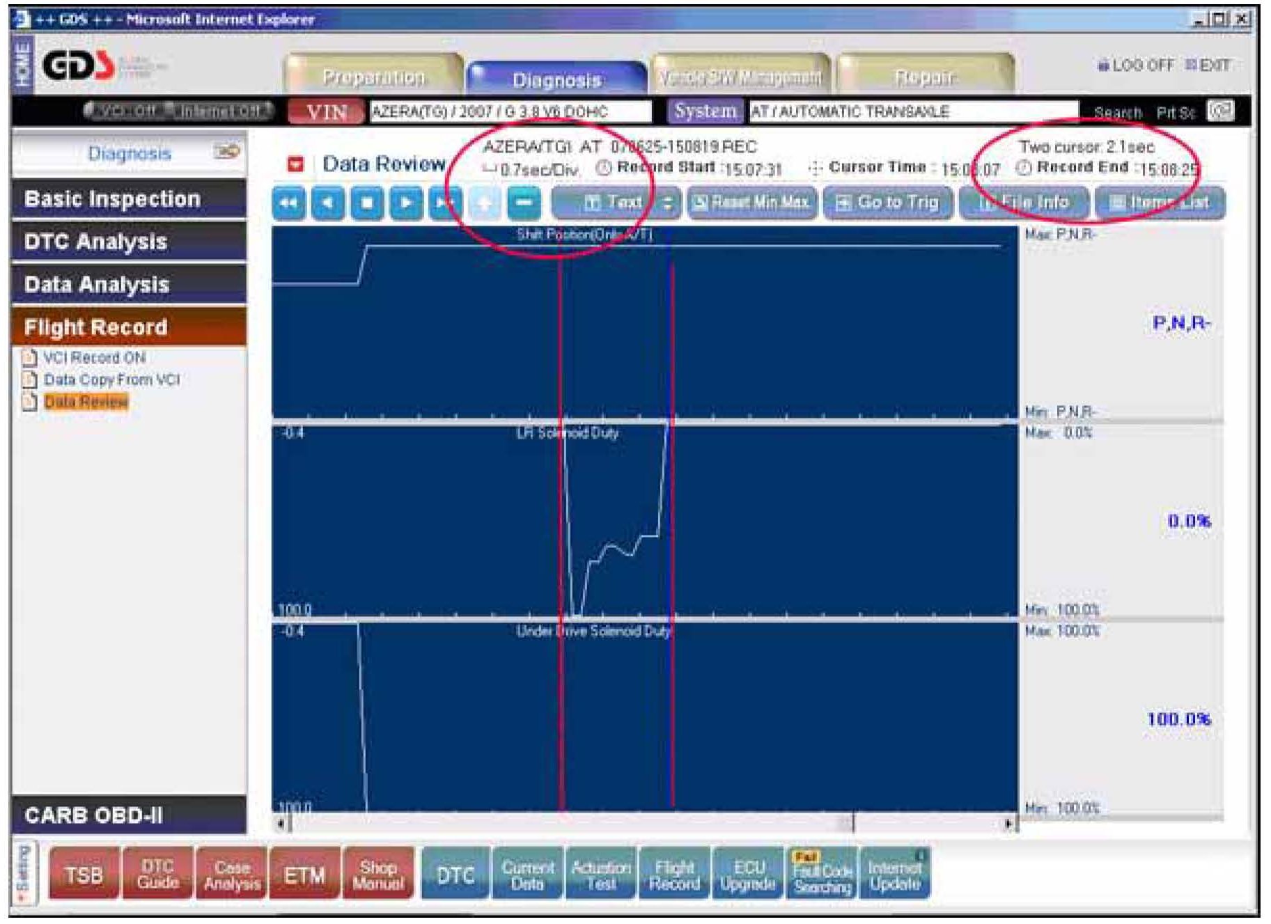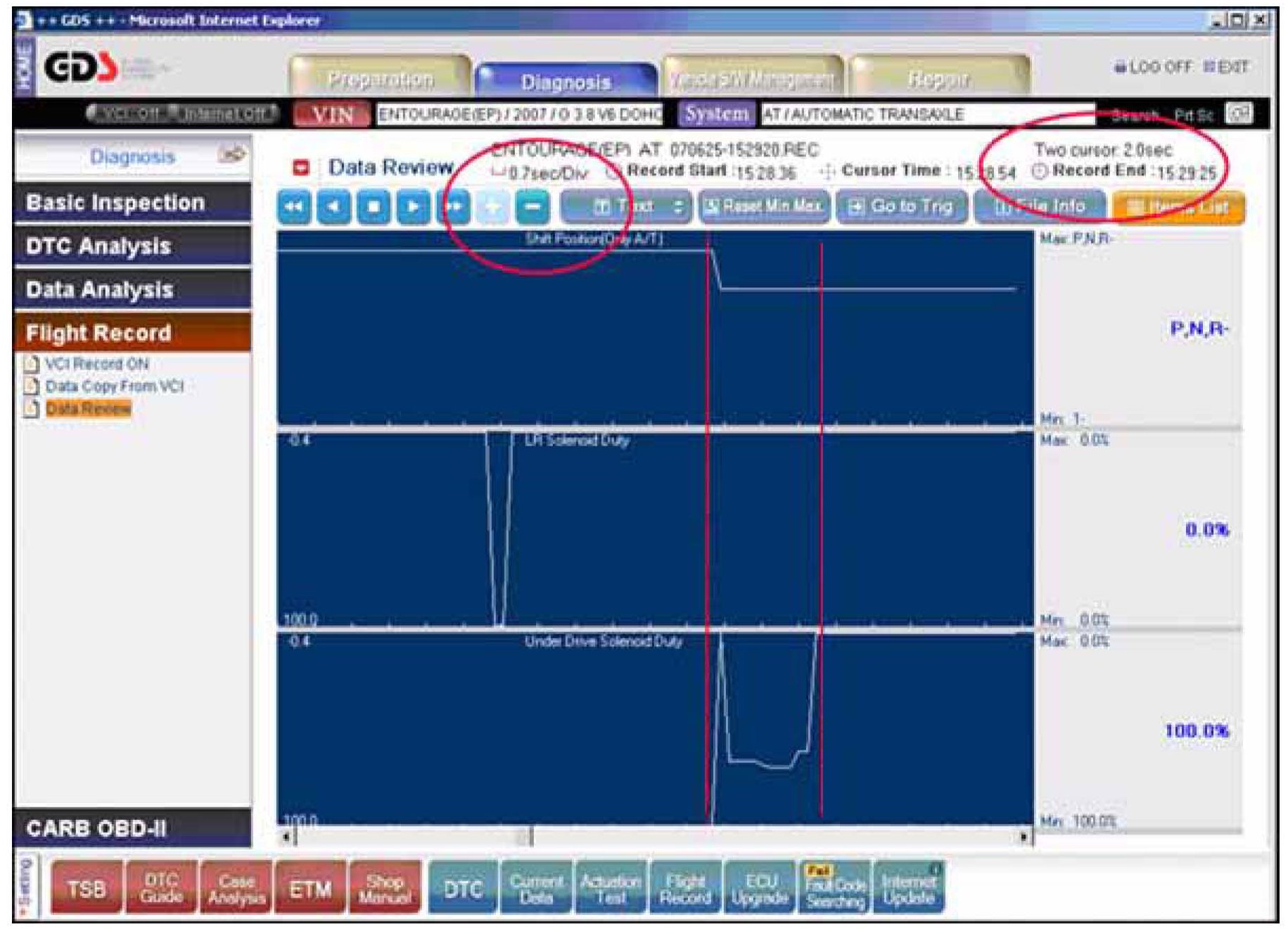 9. Attach the GDS and select VIN and "A/T" "Current Data" and then select "Shift Position", "LR Solenoid Duty" and "Underdrive Solenoid Duty" as shown.
