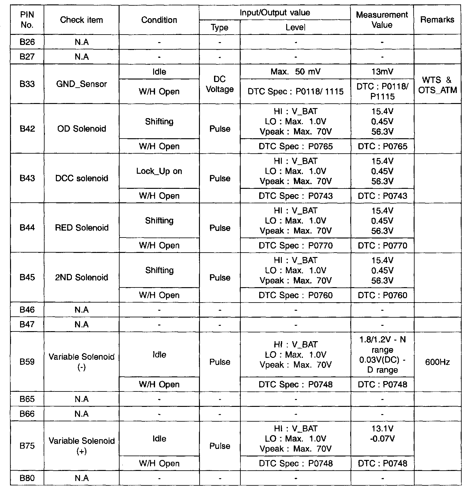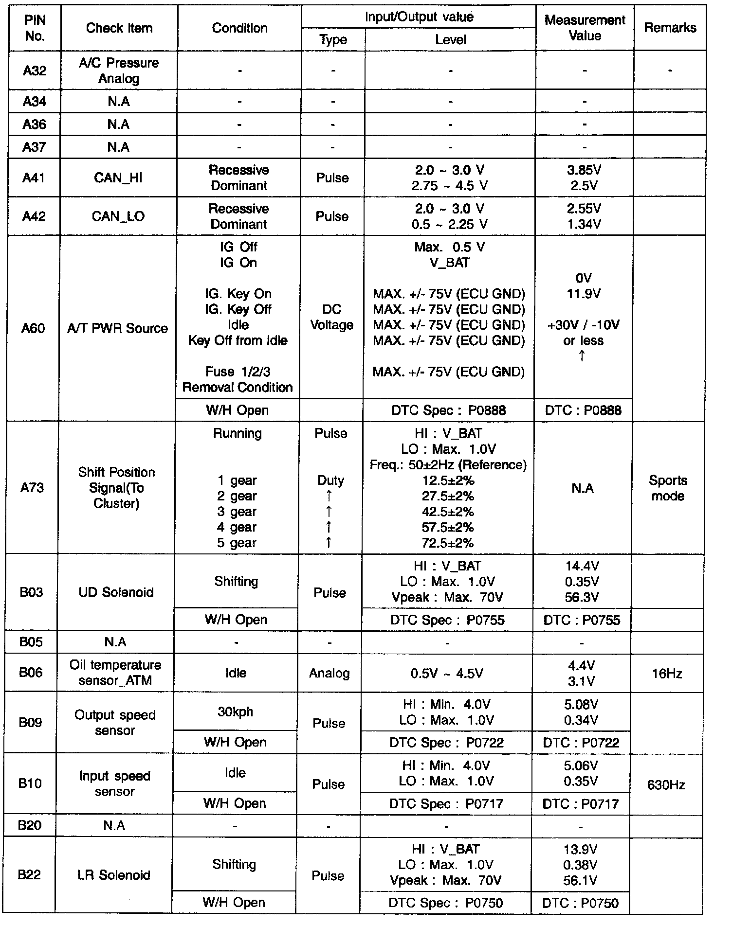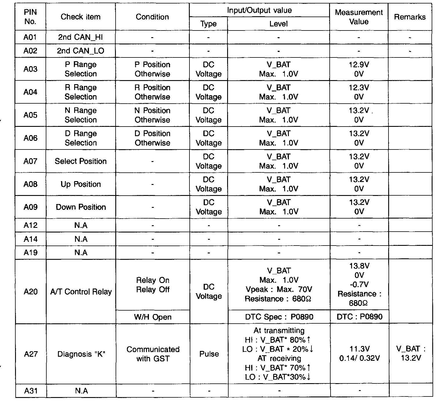 Pinout Values and Diagnostic Parameters