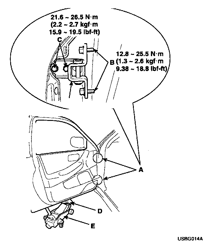 - Loosen the door mounting bolts (B) slightly, and move the door IN or OUT until it aligns flush with the body.