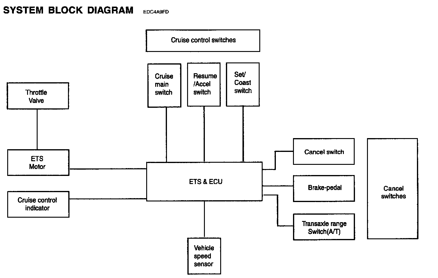 The main components of cruise control system are mode control switches, transaxle range switch, brake switch, vehicle speed sensor, ECM and ETS motor that connect throttle body.