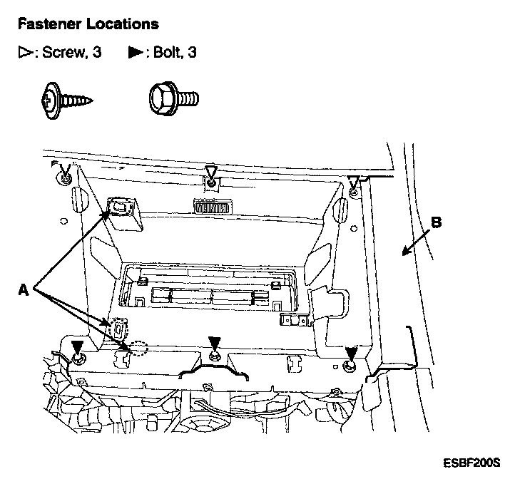 3. After disconnecting the connector (A), remove the lower crash pad panel (B).