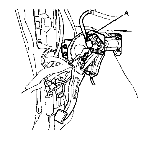 The parking brake switch (A) is a push type. It is located at the side of the parking brake pedal. To adjust, move the switch mount up and down with the parking brake pedal released all the way.