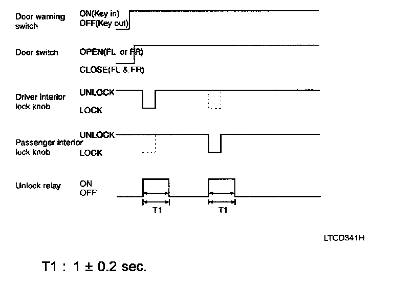 1. If the door switch of driver side or passenger side is locked when door warning switch is turned on and (CAN communication reception), driver side or passenger side door is open, it executes unlock output for 1 second. If the passenger side door remains locked even after the unlock output, it repeats on and off 3 times with the time interval of 0.5 seconds.