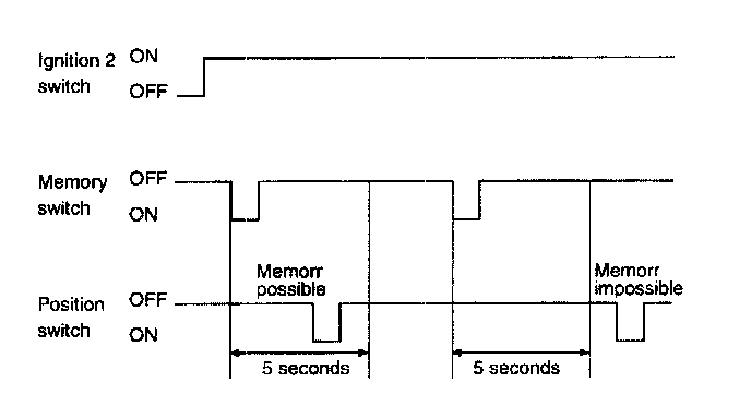 1. If position switch (POS1 or POS2) is pressed within 5 seconds after pressing the memory switch under ignition 2 on, it registers current mirror position. (Switch module sends in LIN communication). (Memory permit status lasts for 5 seconds after memory switch ON. After 5 seconds, memory permits status terminates. In other words, current position is registered if the position switch (POS1 or POS2) is turned on, during the memory permit status). However, RH side mirror position is not registered during the LH side mirror manual switch operation.